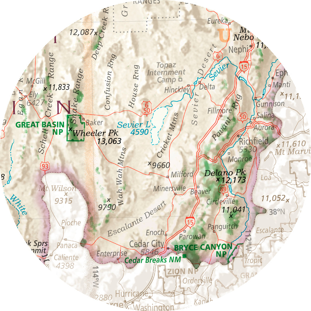 I created this illustration by draping lines and type from the 2010 edition of my Essential Geography of the USA over shaded relief that was rendered in 1969 by Richard Edes Harrison. The landforms of the Great Basin are emphasized, while its political boundaries are downplayed.