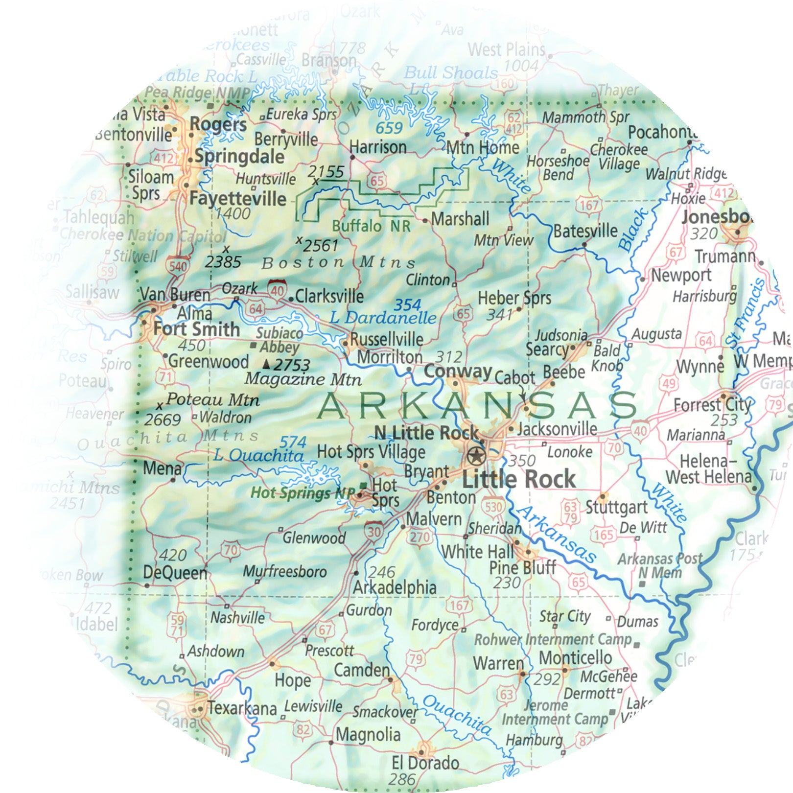 A uniquely-informative geographic reference that doubles as eye-pleasing art, Portrait of Arkansas is archival in quality, and fits standard pre-made picture frame sizes.