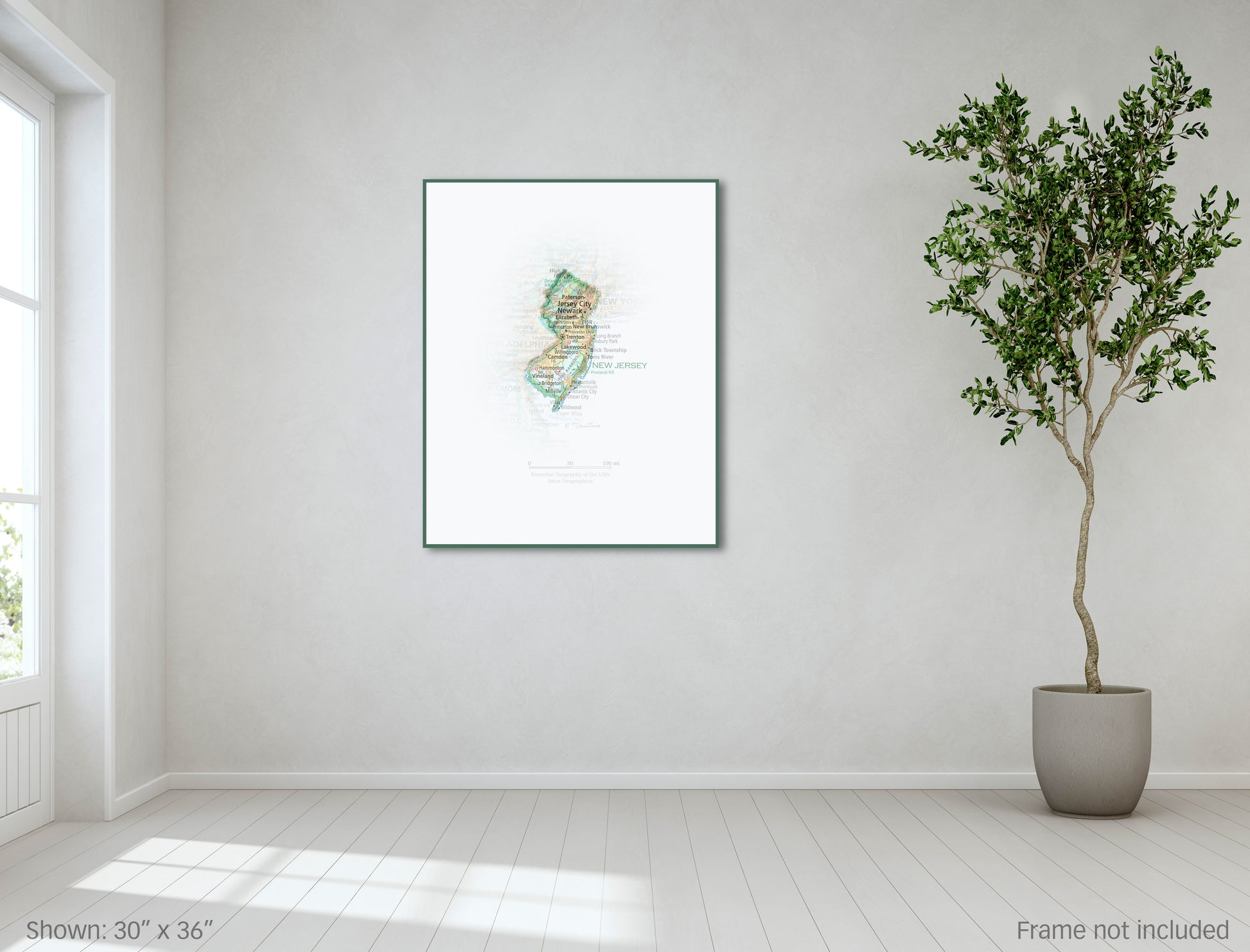 A uniquely-illustrative geographic reference that doubles as eye-pleasing art, Portrait of New Jersey is archival in quality, and fits standard pre-made picture frame sizes.