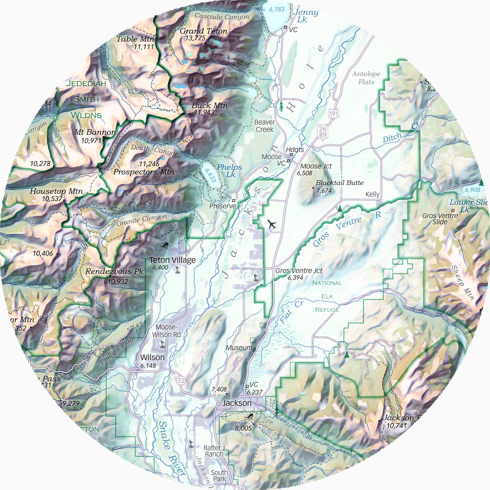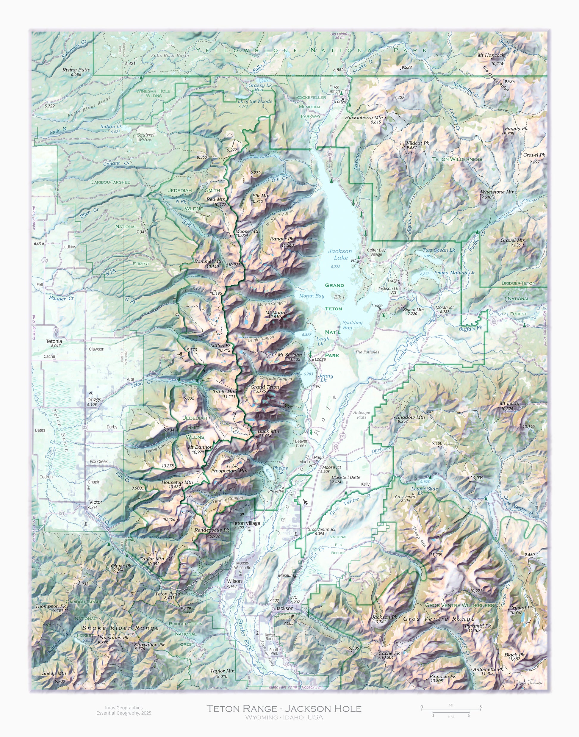 This work captures the dramatic essence of the alpine ridges, deep canyons and broad plains that define this iconic landscape. Guided by the philosophy Robert Bateman, whose work "Chief" can be viewed at the National Museum of Wildlife Art, just outside of Jackson, I used techniques I developed over the last decade to depict the terrain in the aesthetic of a painting. Type I used sparingly, and only to identify principle features. These visual qualities are why this work captures the dramatic physical essence of this iconic place.