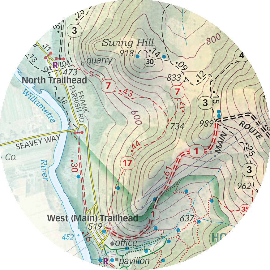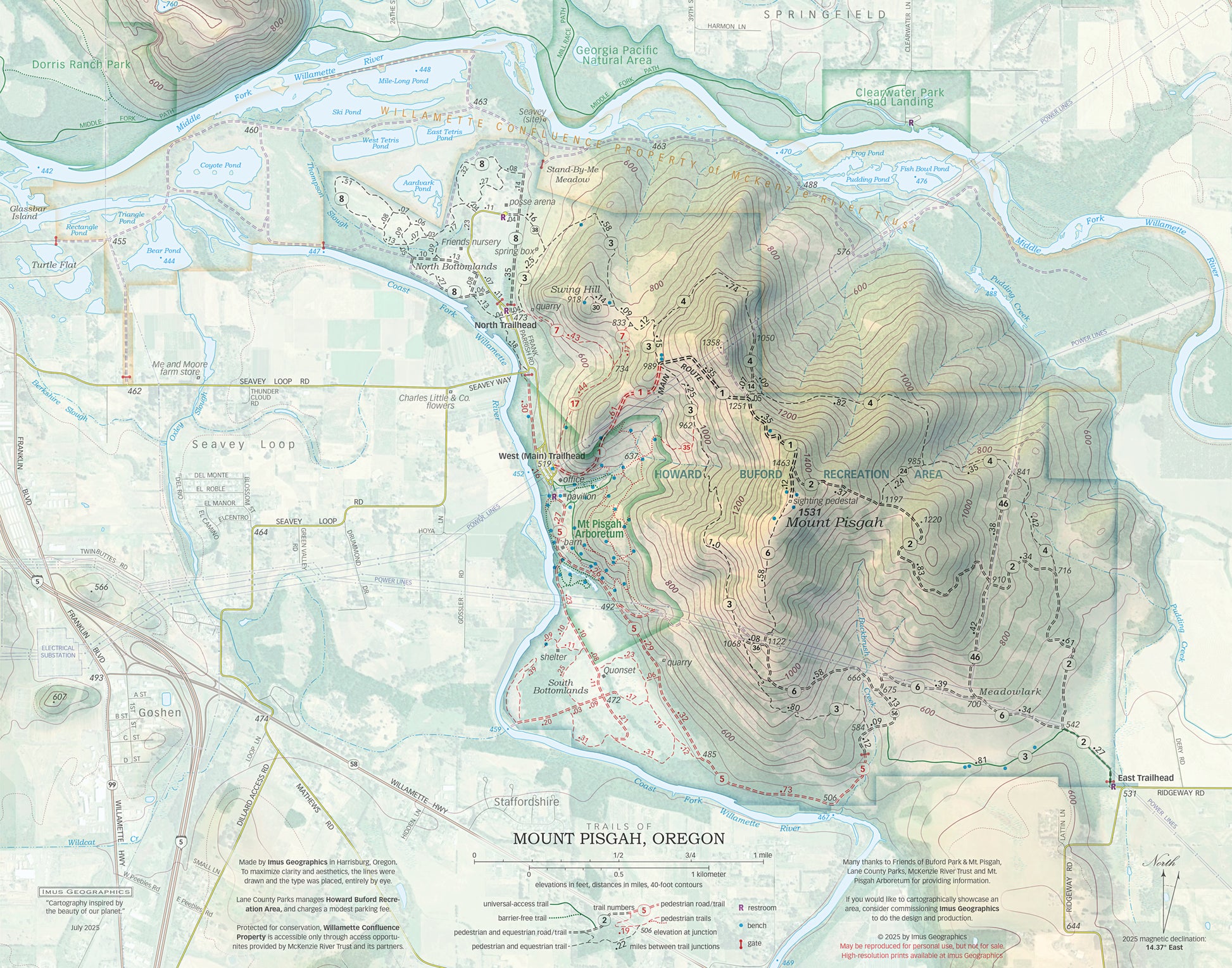 This work shows pedestrian trails in red and pedestrian/equestrian trails in black; plus trail numbers and distances, 40-ft contours, spot elevations, benches, and much more. The cartography rests on a depiction of Mount Pisgah as it might appear in the warm glow of a summer evening. The combination is informative and pleasing to the eye.
